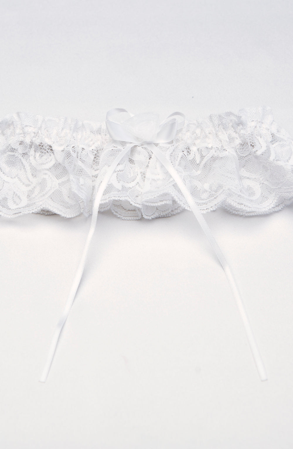 Pretty lacy leg garter with soft satin trim and white lace on top and bottom.