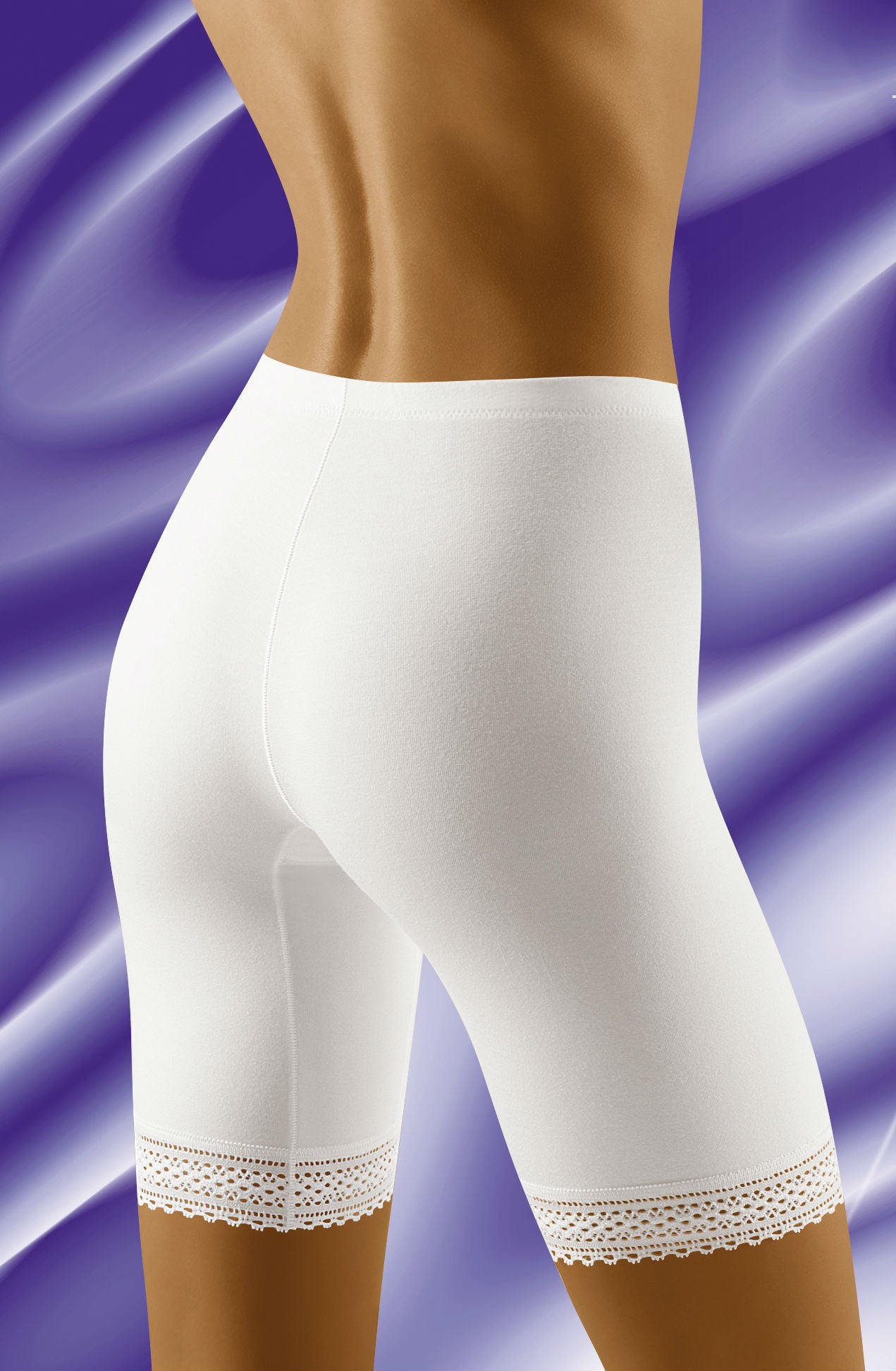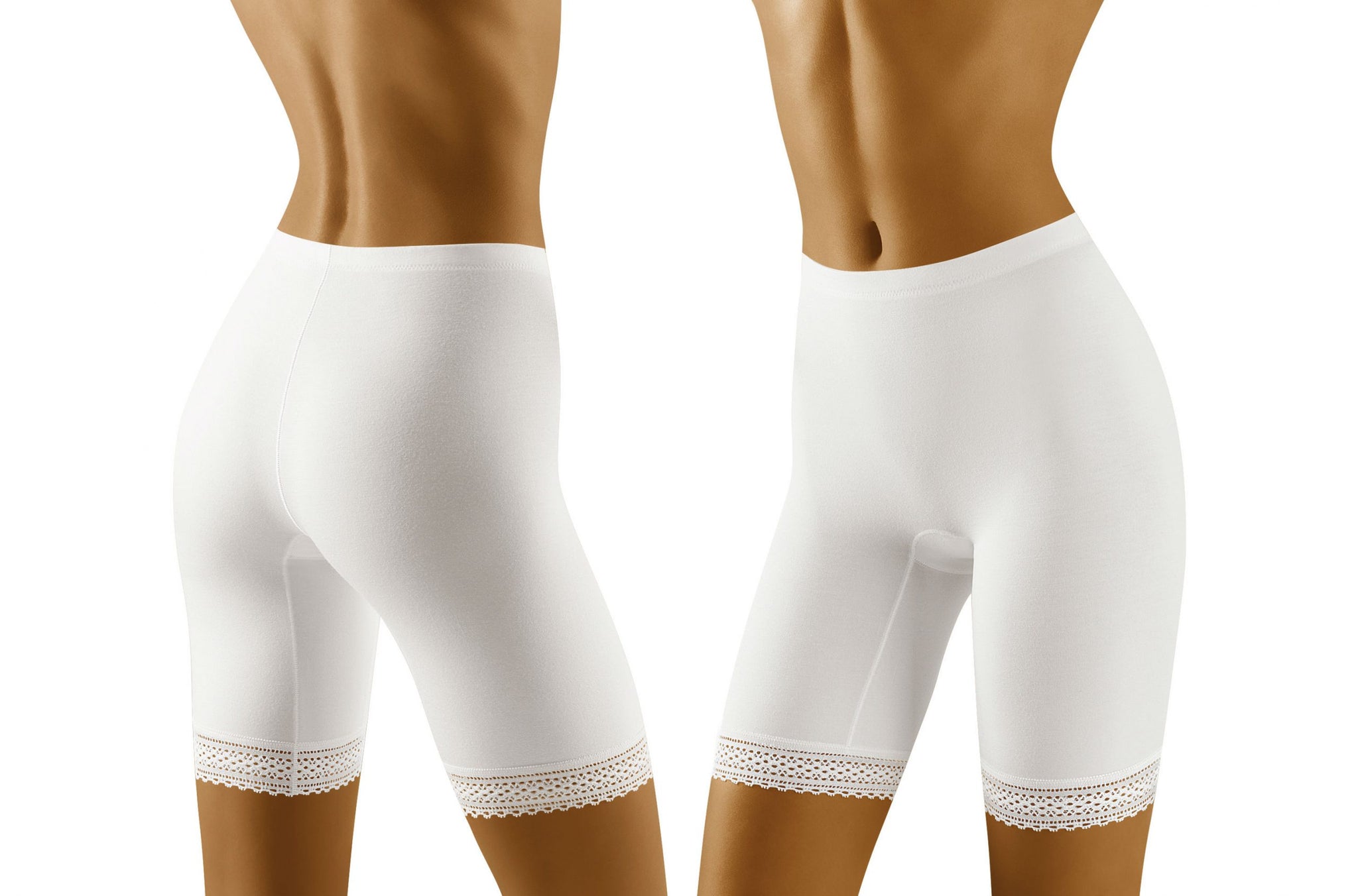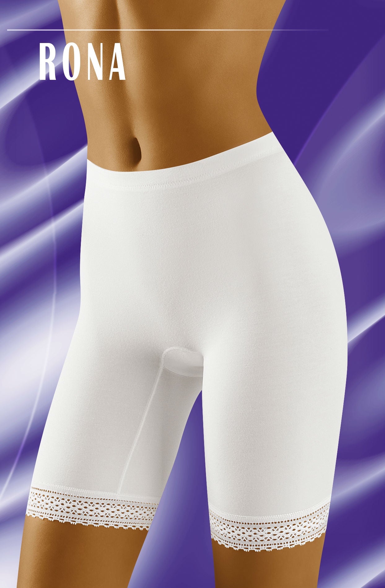 Rona is a lovely pair of shaping shorts with an elasticated micro-adjustable waistband and elasticated lace belt decoration at the bottom of the shorts. The front of the shorts are completely plain and the seams are delicately sewn which can also be seen on the outer side meaning there's slight patterning on the seams. Inside is a cotton gusset which is sewn into the shorts. Gentle and soft knitwear prevents irritations and skin irritations in sensitive areas for maximum comfort. The specially selected cup shape adds an extra silhouette on the figure. Available in white beige and black and can all be ordered separately on the website. This item arrives packaged in a branded Wolbar box presenting an image of the product.