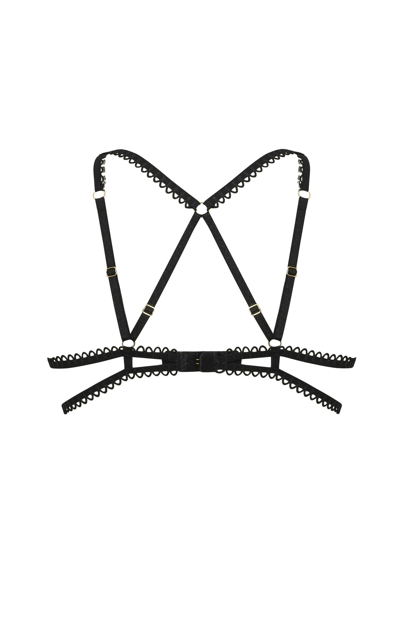 A Romantic bra crafted from sexy black mesh and floral detailing on the sides. Cheeky opening at the cleavage and chest with seductive rouleau loop detailing on the straps. Golden hoop detailing at the neck and straps. Adjustable shoulder straps and hook closure at back. Complete with your matching Romantic thong.